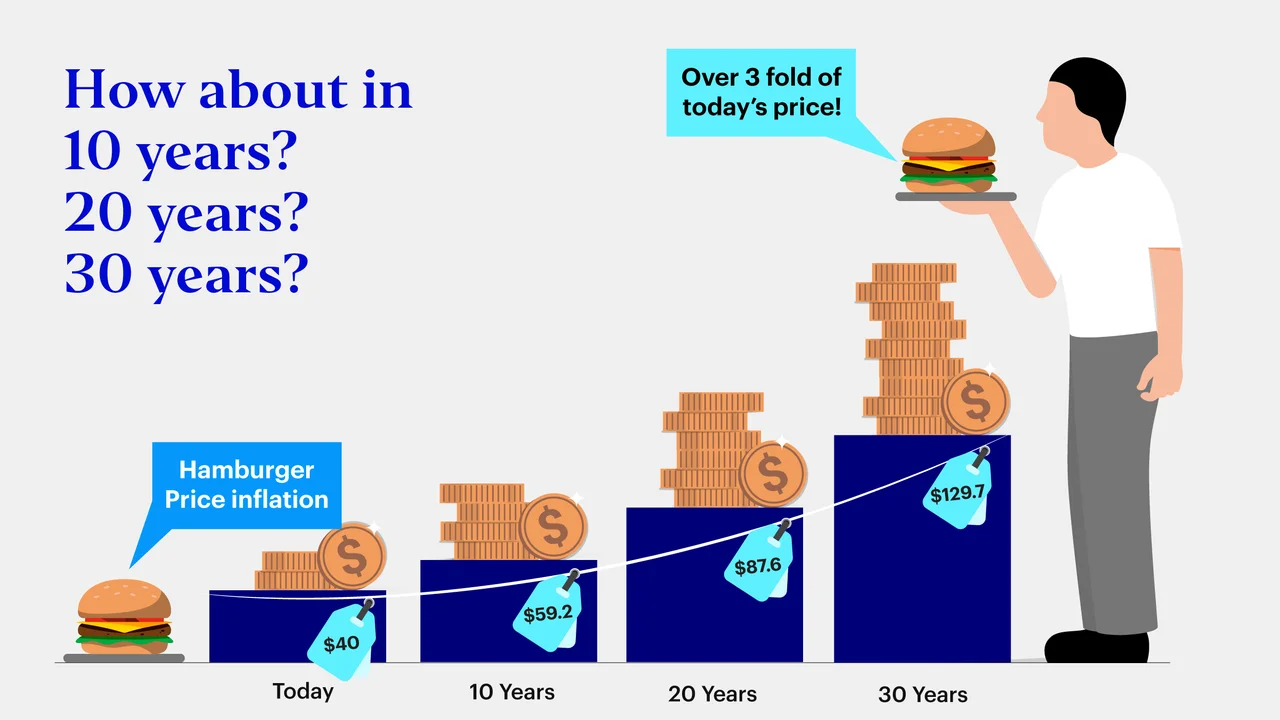 Suppose you can buy a burger set for $40 today and the annual inflation rate is 4%. Next year, the same burger set will cost 4% more at $41.6. It does not seem much, right? But over time, inflation will increase the cost of the burger dramatically.